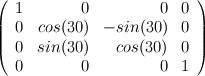 Provide the 4x4 matrices in row,column format for a set of Geometric transformations that include 30 degree rotation, translation of 50 in x direction and -100 in y direction, and with a scaling of 1.5 applied in both the x and y directions.